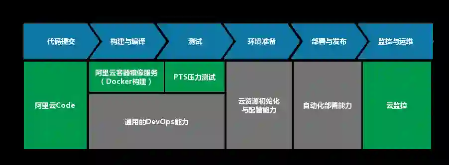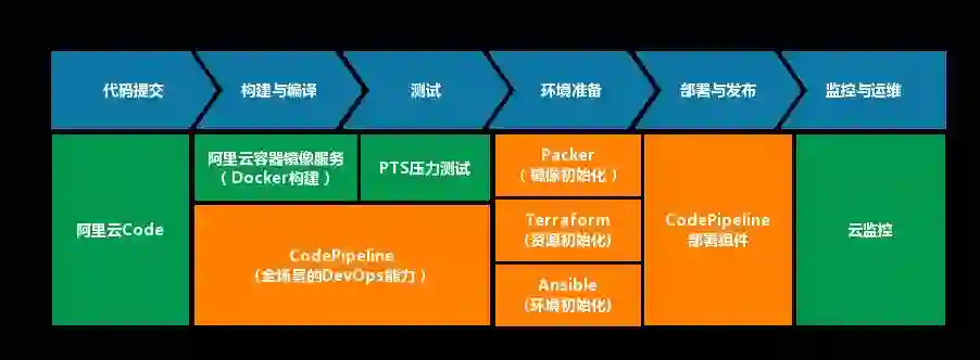 在这个流程里阿里云怎么做?代码提交部分,阿里云有云 Code ;构建与编译,阿里云有镜像服务;测试有PTS压力测试;环境准备和部署与发布这部分阿里云以前是空的;监控与运维有云监控。在通用的 DevOps 能力上我们做了一个产品叫 CodePipeline ,环境准备上我们有 Packer 、 Terraform 、 Ansible 。
