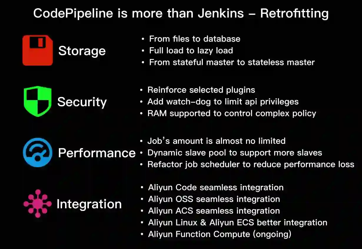 Jenkins 社区里的插件大约有几千个,我们不能保证每一个插件都是安全的,所以在 CodePipeline 开放插件的时候一定会先做一次安全扫描和安全加固。