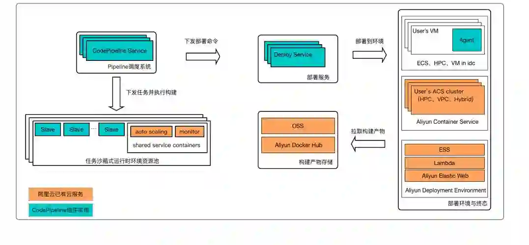 第二个部分是右边这个 Deploy Service ,帮你做各种各样环境下服务的部署。大家传统意义上理解,如果想要部署到你的集群上,可能需要和你的集群有一个安全策略上的交互, deploy Service 是反打,装一个 Agent ,可以在你的VPC甚至你的IDC里来使用 Agent 。再往下是中间产物,比如你想构建一个放在VM级的目录,把 Jenkins 中间的部署末路上传到oss,由oss做分发,再往下则是 Docker Hub 。