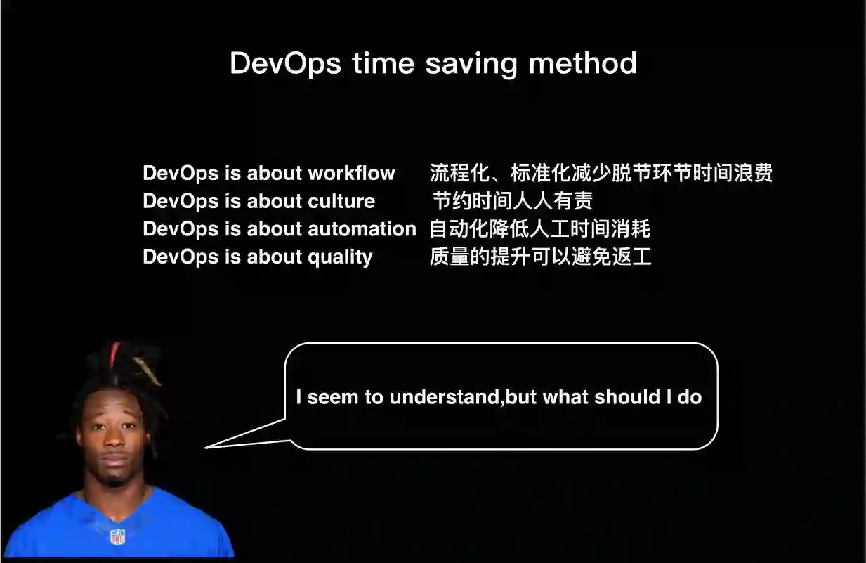 你可以想一下,大家引入 DevOps 要解决的根本的点:我要自动化一些流程,我要能快速的完成发布,我要提高质量,这些实际上根本都是一个时间问题, DevOps 其实就是来帮你节省你的时间。有人会说我提高代码质量和节省时间有什么关系,提高了代码质量就省去了返工的时间。