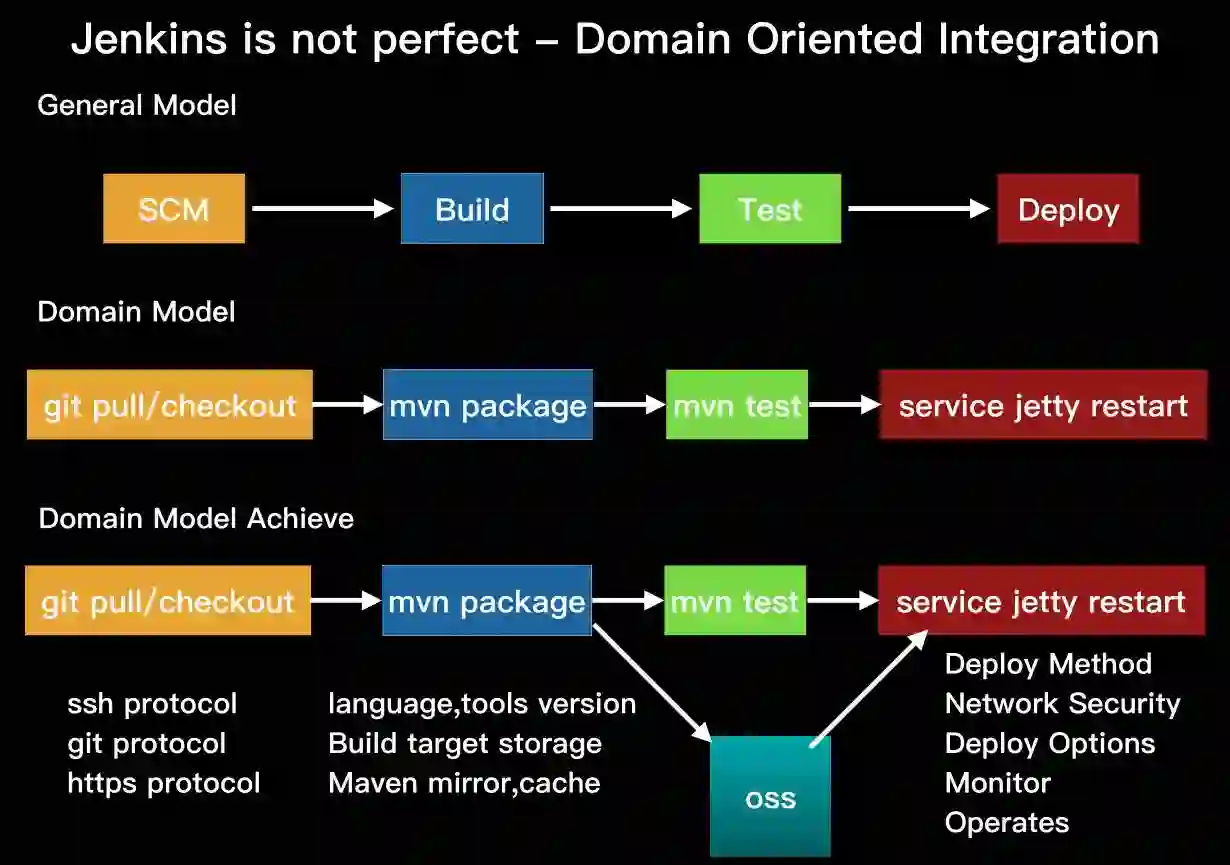 第三个是领域模型实现,比如原来的时候, checkout 这边需要有协议, package 需要有特定版本的,需要有一个构建完之后的中间产物放置的位置,可能会涉及到一些 mirror 、 cache 。这都是一些细节的东西,但是又和你最终使用 Jenkins 环境相关。比如在阿里云上你可能会把中间的构建产物放在私有的oss上;
