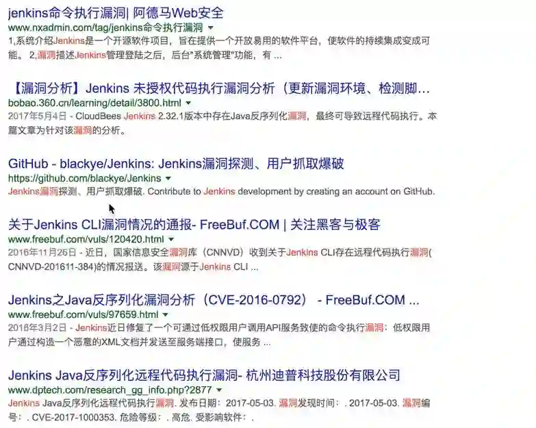 这几个是在谷歌里可以看到的常见的 Jenkins 的一些漏洞。比如第一是命令执行漏洞,这种是可以越权的;第二个是未授权代码;第三个是 Jenkins 漏洞探测、用户抓取爆破。