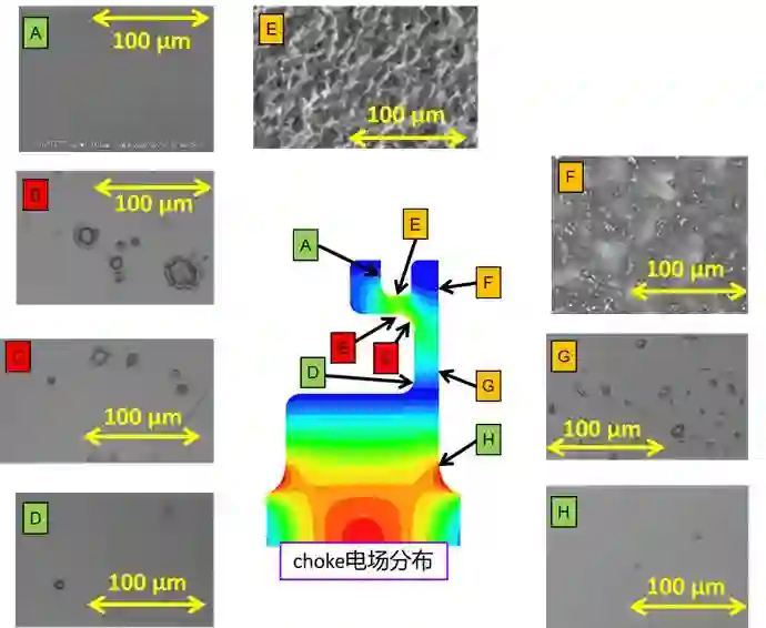 论文进而设计并制作Choke-mode加速结构,开展高梯度实验,对choke中的射频击穿现象进行了深入研究。提出利用场致发射电流信号作为choke中射频击穿事件的依据,并在表面形态观察中得到了验证。研究发现choke内过高的电场和较小的尺寸引发了严重的射频击穿,如下图所示,其中B、C所在的choke区域射频击穿点较多,限制了加速结构梯度的提升。通过降低choke区域的电场和扩大choke区域的尺寸,论文工作设计并研制出高梯度Choke-mode加速结构,实验中最大加速梯度可达130 MV/m。通过比较不同尺寸choke的高梯度实验结果,论文总结出评估Choke-mode加速结构高梯度性能的参量,为将来设计高梯度Choke-mode行波多腔加速结构打下了基础。