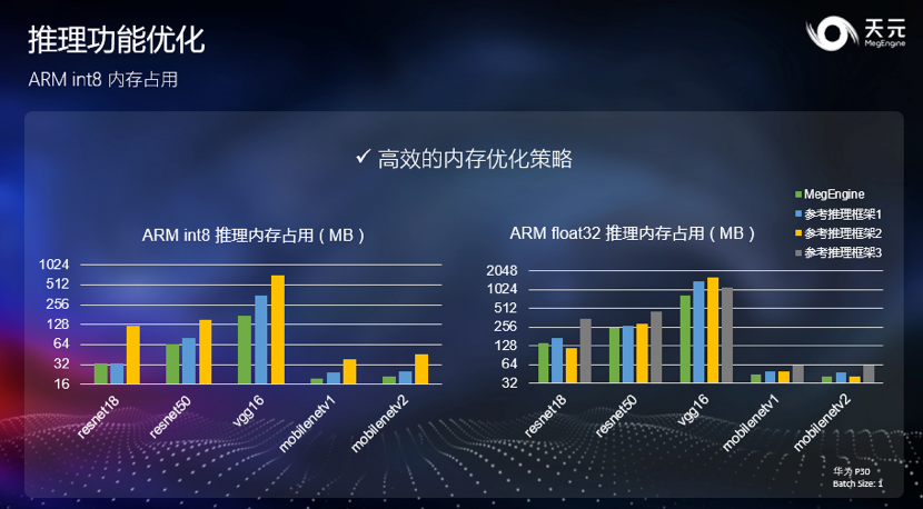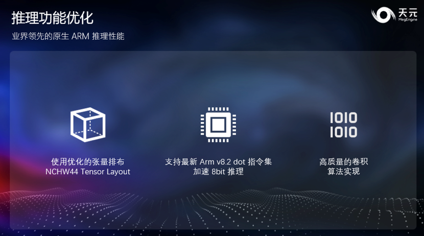 此外,天元在 CUDA 和 x86 上也提供相对于 float32 显著的提速效果。与 Arm 类似,int8 推理的耗时仅有 float 模型的 30%~50%。在 CUDA 上,天元可以充分发挥出 Tensor Core 的计算能力,榨干显卡的计算能力;而在 X86 上,由于 X86 指令集的原因,天元可以在支持 AVX512-VNNI 指令集的最新一代处理器上得到比较明显的 int8 提速。综上,原生的 int8 高效推理性能,可以让开发者方便地进行模型推理部署,同时充分发挥出硬件的计算能力。 推理功能优化 业界领先的原生 ARM 推理性能