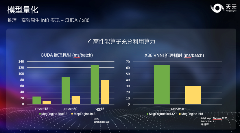 上图展示了 ARM 上的推理性能对比。可以发现,通过转换至 int8,天元使得常用网络获得了至多 3 倍的提速。此外,针对手机上常用的小模型,天元提供了更好的优化效果,加速效果更加明显。