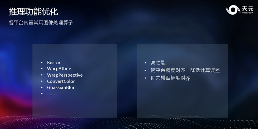 除了 NN 算子之外,在深度学习模型应用的场景中,各类 CV(也就是图像处理)算子往往也作为模型的预处理步骤存在,这些步骤的性能和精度会高度影响一个深度学习模型的落地效果。天元内置了常用的 CV 算子,并进行了高度优化,它们可以作为模型的一部分存在,实现框架的统一优化。在推理时,解码后的结果可以直接输入框架,通过一次调用完成全部 CV 操作和 NN 算子,简单方便。在深度学习模型的落地中,一个重要的步骤称为 “对分”,它能确保模型训练与最终推理的行为完全一致。天元提供的 CV 算子在各平台间对齐精度,尽全力避免训练与推理的差异,降低其中的误差,从而显著降低对分的成本,助力模型快速落地。新增复现模型与训练功能增强 除本次核心技术升级外,天元也一直在更新更多模型复现,助力开发者利用天元完成更多工作。