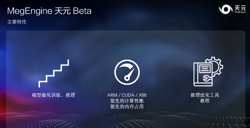 1. 完善量化训练和量化推理功能。天元 Beta 版本提供了灵活的量化训练和高效的量化推理的能力,让开发者可以快速的完成高精度的量化训练并直接部署到推理侧,以最小的精度代价获得最高的推理性能。 2. 添加对 ARM CPU 的支持。天元添加了对 ARM CPU 的支持,在 ARM、CUDA、X86 三个主流计算平台上都提供了经过深度优化的 kernel 实现,结合天元优异的计算图优化技术,在量化、浮点模型上均提供了业界领先的计算性能和内存显存占用。 3. 优化推理功能。天元对推理功能做了一系列的功能优化,提供 Profile 工具、上手指南、性能优化教程等内容,帮助开发者快速上手,获得更高的推理性能,让开发者在推理的时候可以使用更方便,开发更高效。 另外,天元 Beta 版新增 10 余个 SOTA 模型,并正式提供中文版 API 文档,还新增了 Objects 365 Dataset 的 API 和多机训练参数打包等功能。 除了功能和性能上的改进之外,天元框架还与小米 MACE、OPEN AI LAB(开放智能)Tengine 等推理框架进行了深度集成。