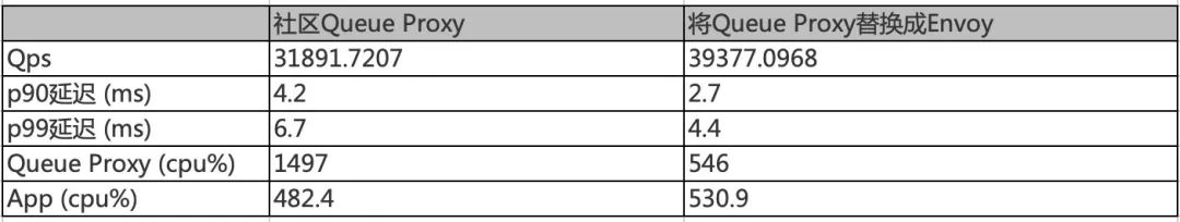 使用 Envoy 替换 Queue Proxy 可将 QPS 额外提升 12%,单位 CPU 百分比支撑的 QPS 基本一致