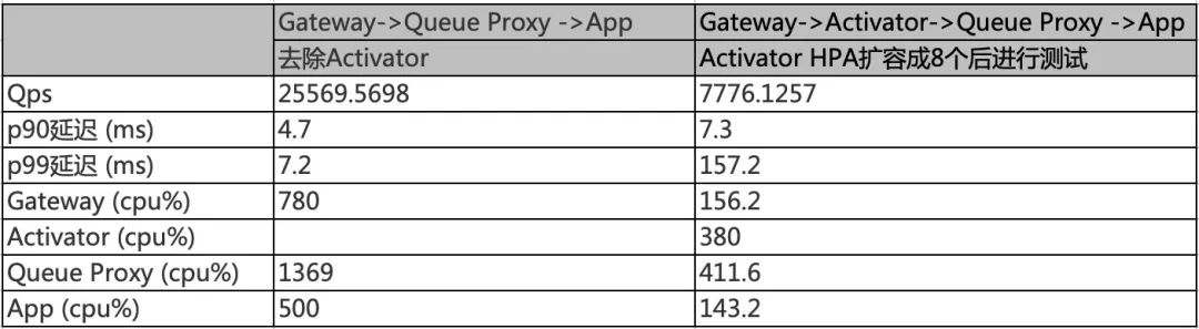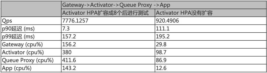 Activator 加⼊到数据路径中,在没有扩容情况下,性能⾮常差 QPS 只有 920,经过 HPA 扩容成 8 个后,QPS 可达 7776.1257