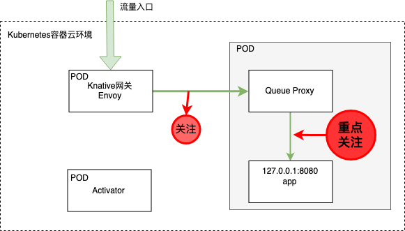 冷启动充当看门人,业务 POD 0-1 流量会经过 Activator 组件