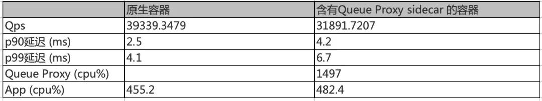 经过前文的分析 Queue Proxy 以 Sidecar⽅式存在是 Knative 架构要求,当前测试 case 情况下,加⼊Queue Proxy Sidecar 后,相⽐原⽣容器,QPS 从 3.9w->3.1w,P90 延迟翻倍(2.5->4.2)。