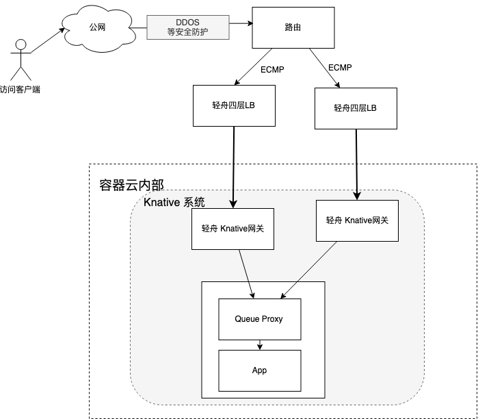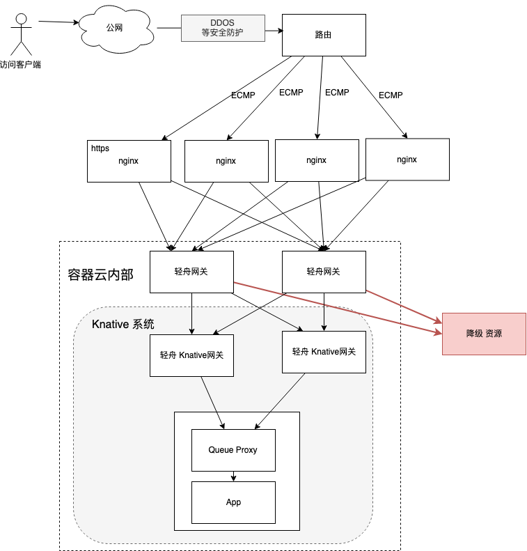 在选型之初,我们打算按照如下架构图,流量接入到 Knative 系统。流量经过 Nginx Https 代理 -> 轻舟网关 -> 轻舟 Knative 网关 -> Queue Proxy -> 业务 App,其中: