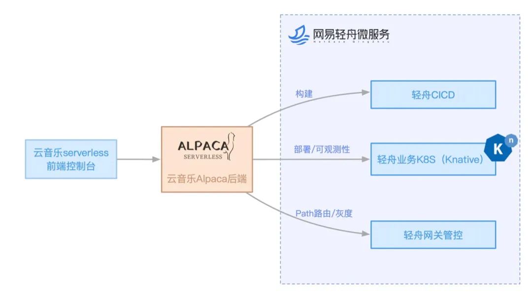 目前,网易轻舟云原生团队已经和网易云音乐前端团队合作共建云音乐 Serverless 部署平台 ALPACA,将 Serverless 用于前端场景。该平台架构如下图。