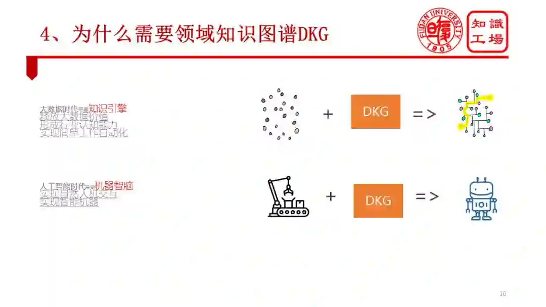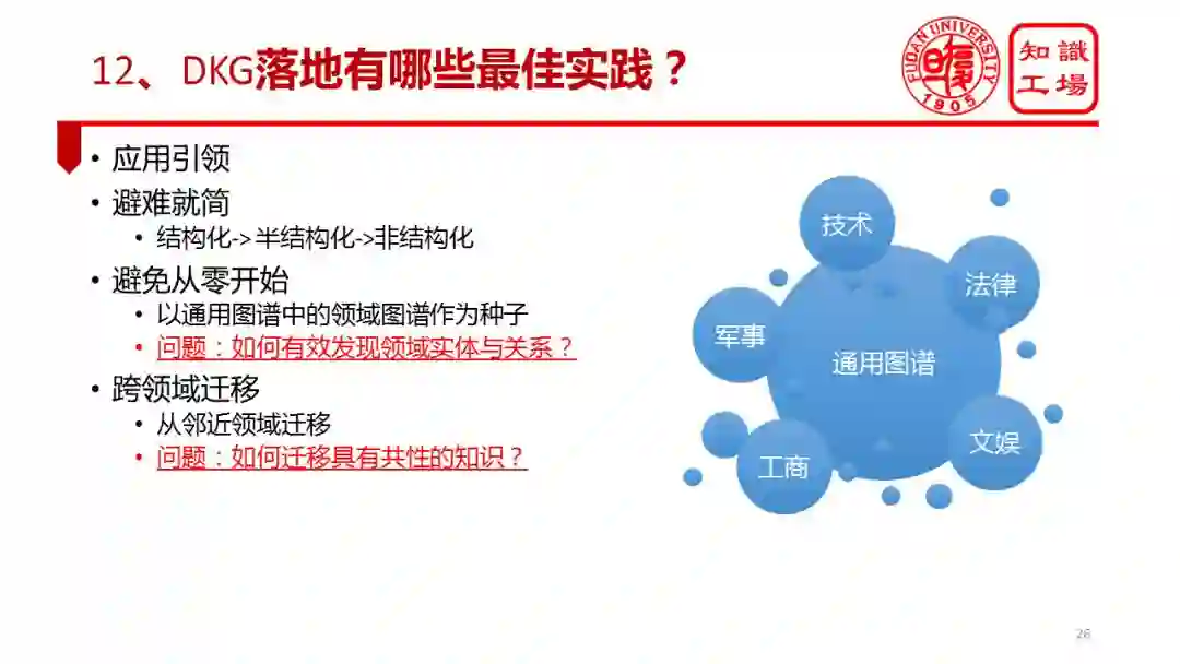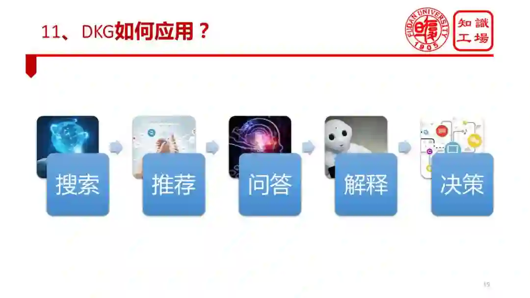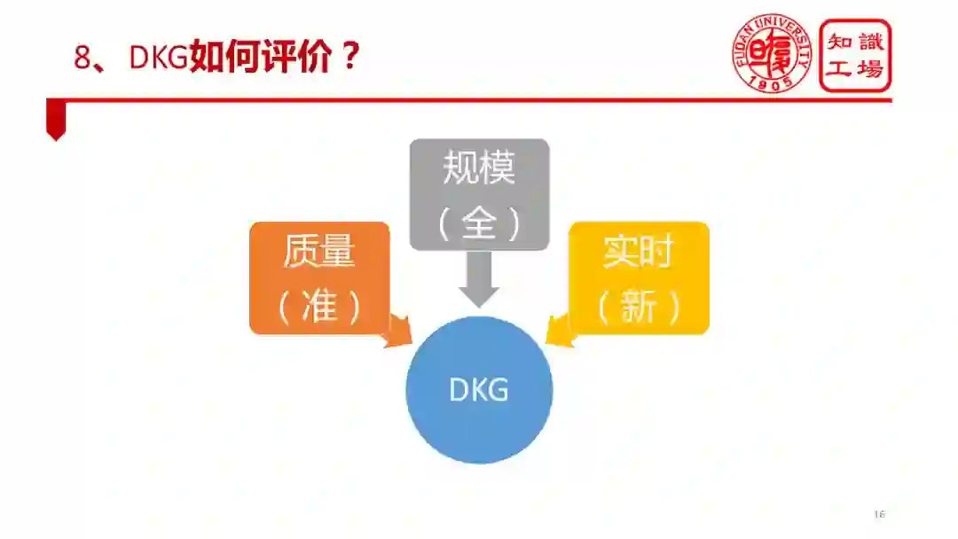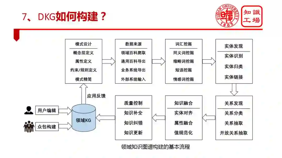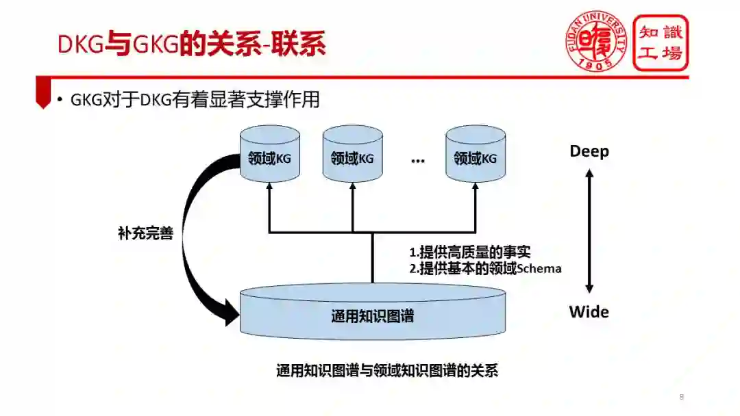 领域图谱建好之后又可以反哺通用知识图谱。复旦知识工场实验室就是按照这个思路持续运营多年。我们先通过通用知识图谱为各领域知识图谱构建提供大量的种子事实,使得快速构建很多领域知识图谱成为可能。各领域知识图谱做的很深很细之后,可以反过来补充通用知识图谱。GKG与DKG这种互补形式的架构在很多领域的知识图谱落地中是个非常重要的架构。