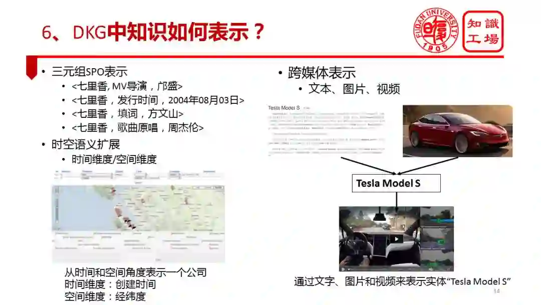 第二、增强知识图谱的跨媒体语义表示。当前的知识图谱主要以文本为主,但是实际应用需要有关某个实体的各种媒体表示方式,包括声音、图片、视频等等。比如对于实体“Tesla Model S”,我们需要将其关联到相应图片和视频。知识图谱时空维度拓展在物理实现上可以通过定义四元组或者五元组加以实现。跨媒体表示可以通过定义相关的属性加以实现。