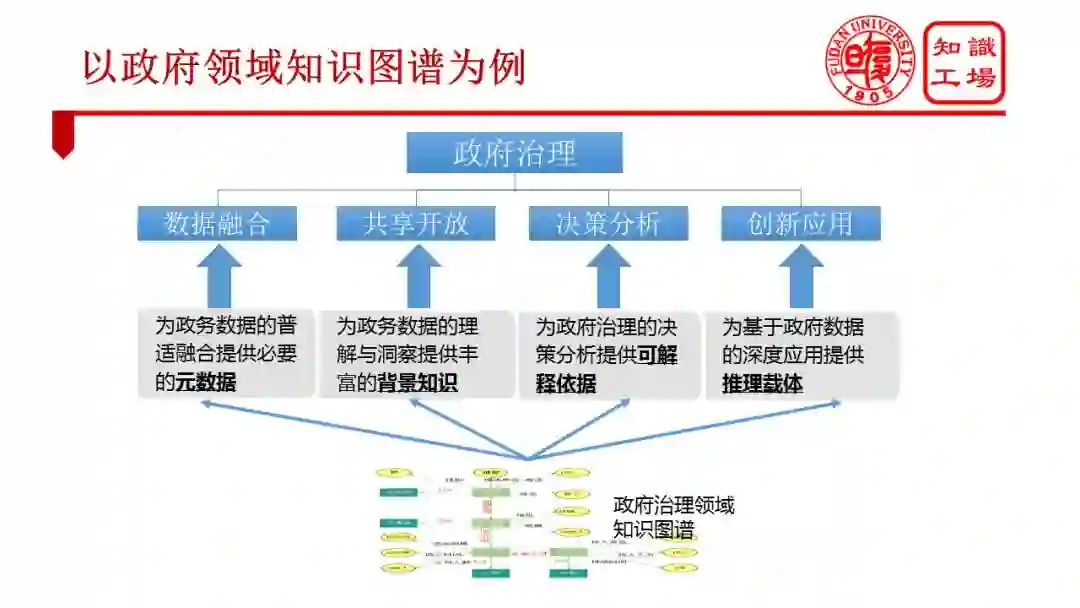 当前政府数据的应用多是简单的检索与分析,缺乏基于深度推理的智能应用。而推理需要一个基本的载体,推理载体的天然选择是知识图谱。基于符号化的知识图谱,可以开展有效的深度推理。