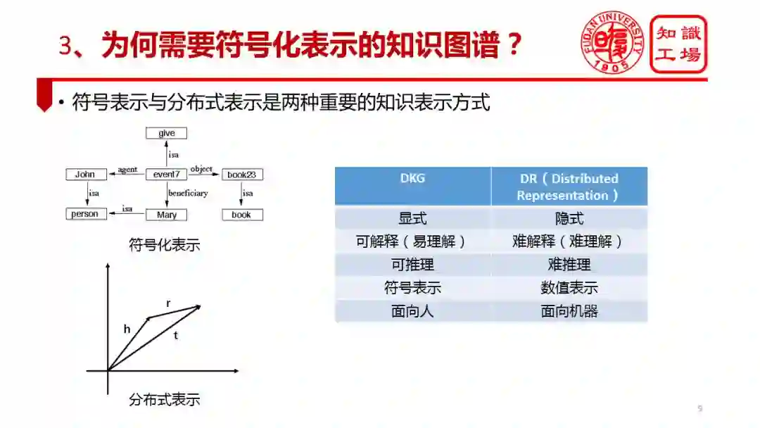 知识表示其实一直以来都有两种基本的方式:符号化表示与数值型表示。两者孰优孰劣?各自的适用场景是怎样的?一直是知识图谱落地过程中常被问及的问题。第一种是符号化(Symbol)的表示,比如说PPT左上角的小规模语义网络,表达了约翰给玛丽一本书这样的事实。这个例子中大量的使用了字符、箭头等符号。显然,符号表示形象直观,易于我们理解。人是可以理解符号的,但是没办法理解向量。知识表示还有一种表示是数值化的分布式表示,它是面向机器的。机器是无法“理解”符号的,只能处理数值和向量。分布式表示是将符号知识集成到深度学习框架中的一种基本方式。符号化表示是一种显性的表示,而分布式表示是一种隐性的表示。符号化表示易理解、可解释,而分布式表示是难解释、难理解的。符号化表示的另一优点在于推理能力。比如数学定理证明都是基于符号推理进行的。虽然基于知识图谱的分布式表示,也可以开展一定程度上的推理,但是需要指出的是分布式推理已经很大程度上丢失了知识图谱原有的语义,分布式推理只能推理语义相关性,而无法明确是何种意义下的语义相关。我个人倾向于认为分布式推理离实用还很遥远。如果非要为知识图谱上的分布式推理找到应用场景,那只能作为很多复杂任务的预处理步骤,将明显语义不相关的元素加以剪枝,后续仍需要能够充分利用符号语义的方法进行精准的语义推理。