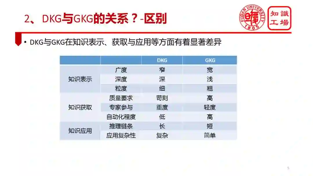 现在回答第二个问题,DKG(领域知识图谱)和GKG(通用知识图谱)的关系和区别。首先来看GKG和DKG的区别。两者之间的区别是明显的,体现在知识表示、知识获取和知识应用三个层面。在知识表示层面的差别可以从广度、深度和粒度这三个维度加以考察。从广度来看,GKG涵盖的范围明显大于DKG。