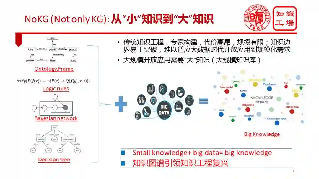 可以设想一下,还有更多的知识表示没有突破规模瓶颈。在大数据的赋能下,其他类型的知识表示也将能够解决更多实际的问题。越来越多的领域应用需要的知识已经突破了知识图谱的范围,对其他知识(比如产生式规则、贝叶斯网络、决策树等)提出了诉求。比如,我们正在尝试联合使用知识图谱与产生式规则实现面向故障诊断的精准语义检索。