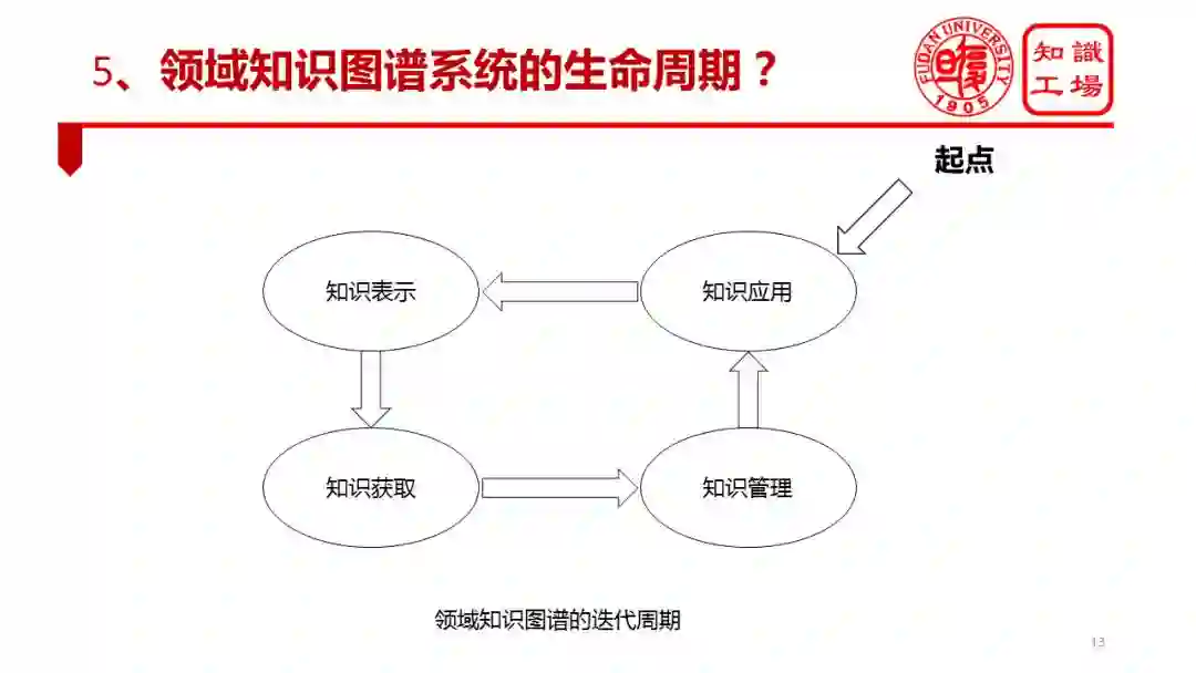 领域知识图谱系统的生命周期包含四个重要环节:知识表示、知识获取、知识管理与知识应用。这四个环节循环迭代。知识应用环节明确应用场景,明确知识的应用方式。