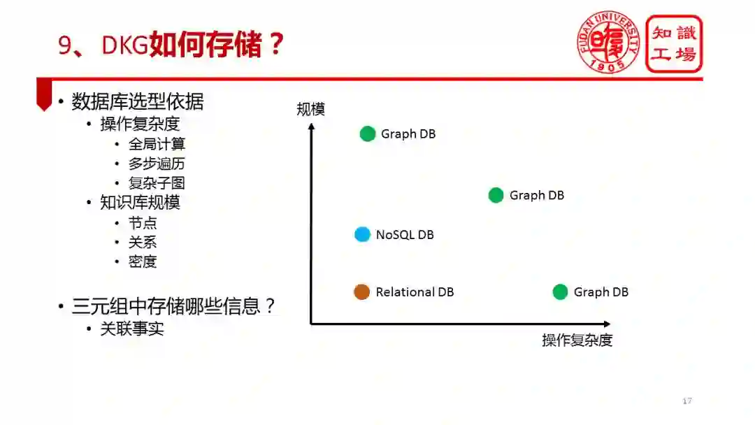 领域知识图谱如何存储也是大家很关注的问题。由于知识图谱本质上在表达关联,天然地可以用图加以建模,因而很多人想到用图数据库对领域知识图谱加以存储。图数据库的确是知识图谱存储选型的重要选择,但是不是唯一选择。传统关系数据库,近几年充分发展的其他类型的NoSQL数据库在很多场景下也是合理选择。那么数据库的选择考虑的要素是什么呢?