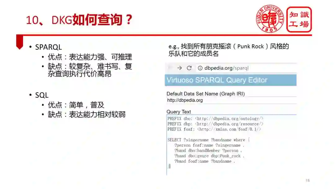 领域知识图谱如何查询?通常对于表达为RDF形式的知识图谱,可以使用SPARQL查询语言。SPARQL语言针对RDF数据定义了大量的算子,对于推理操作有着很好支撑,因而能够适应领域中的复杂查询与复杂推理。