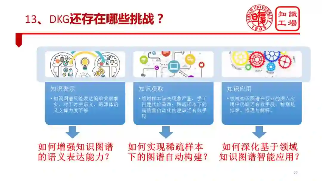 单单知识图谱已经不足以解决领域的很多实际问题。如何去增强知识图谱的语义表达能力,如何综合使用多种知识表示来解决实际应用中的复杂问题是非常重要的研究课题。第二,在知识获取方面,领域知识图谱一般样本很小,如果需要构建抽取模型,那就需要基于小样本构建有效的模型。