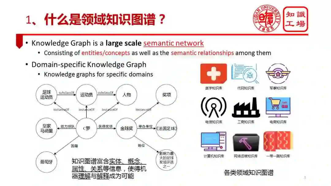 那什么是领域知识图谱呢?比如“足球知识图谱”,里面大多都是跟足球相关的实体和概念。如果知识图谱聚焦在特定领域,就可以认为是领域知识图谱。领域知识图谱的范畴再大一些就是行业知识图谱了,比如农业知识图谱。
