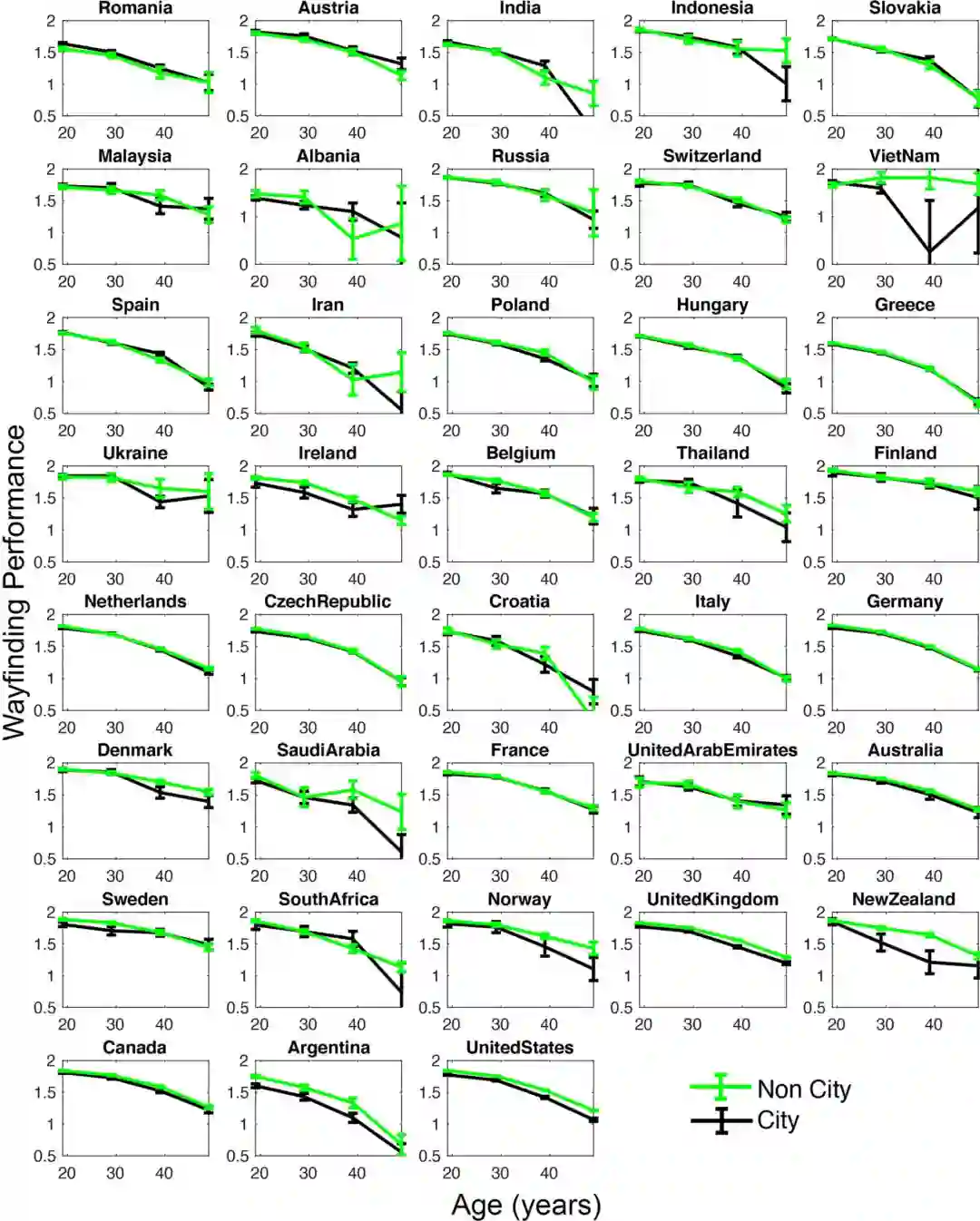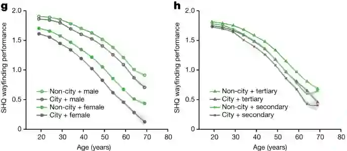 此外,人们空间导航的能力整体而言会随着年龄的增长而逐渐衰退,不过,如果是在美国城市里长大的,那么你找路的能力相当于比同龄人老了5岁。