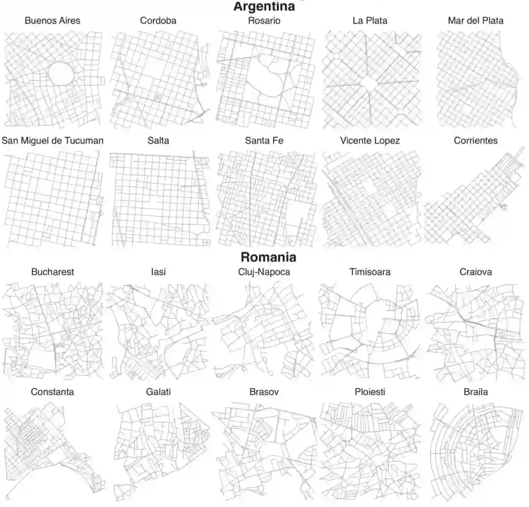 经过计算,研究人员得出了38个地域最大城市的平均街道网络熵值 (SNE):网格状城市(例如芝加哥)的SNE较小,而结构更有机芜杂的城市(例如布拉格)的SNE较高。