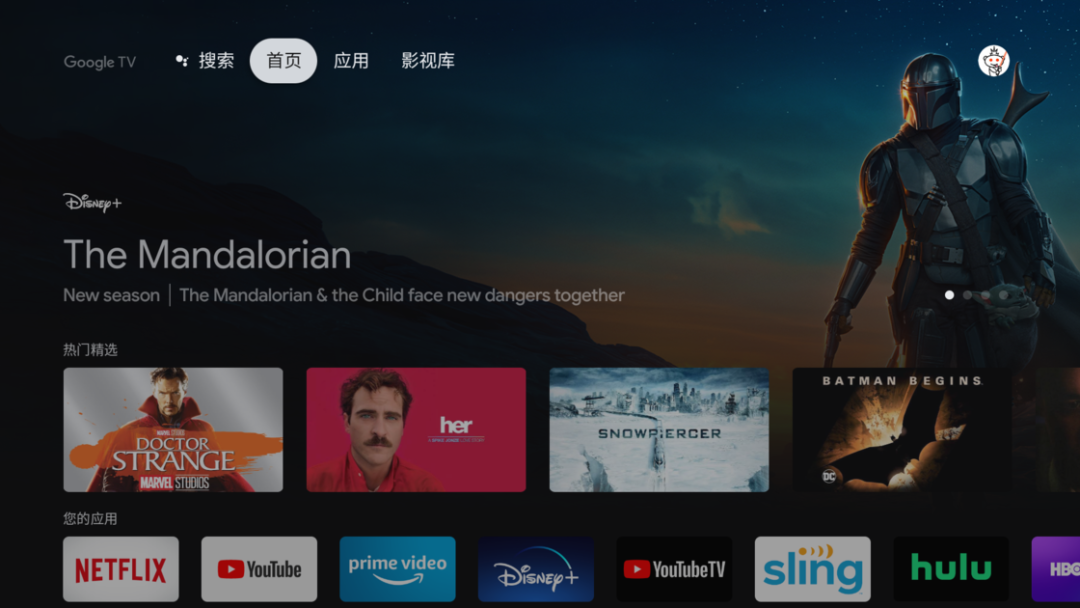 整个系统非常简洁,主页面根据你订阅的服务、你的兴趣爱好和自家算法推送剧集,像我订阅了 Disney+ 这几天 The Mandalorian 第二季正好开播,我的首页也就出现了它。