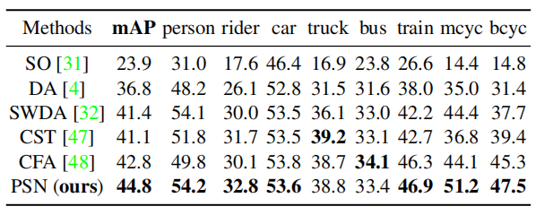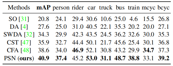 表 4 在 Cityscapes→Foggy-Cityscapes 数据集上的表现