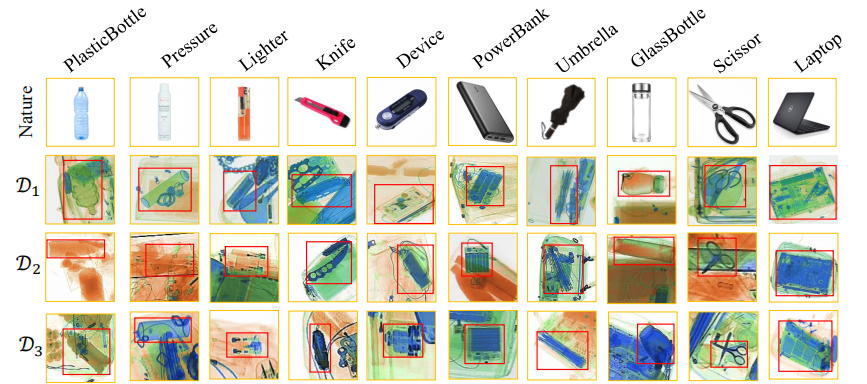 在本文中,研究者们以 X 光安检场景为例,首先从域间偏移产生原因入手,结合常见的自然场景变化,分析外生和内生域间偏移的异同点。然后展示研究者们构建的内生偏移自适应能力评估基准,以及噪声抑制网络,探索目标检测模型在复杂环境下由于感知设备变化导致的脆弱性问题,寻找不同类别物体的领域无关特征的最佳表征。
