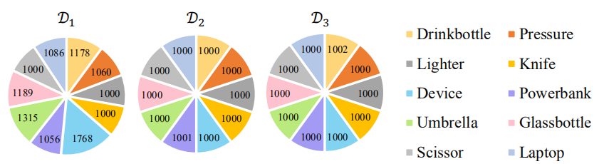 EDS 数据集包含了来自 3 台不同 X 光机器的 14219 张图片, 其中 10 类物品, 共计 31655 个目标实例,均由专业标注人员进行标注。图 1 展示了 10 类物品实物图和不同 X 光机器下的成像图,图 2 展示了 EDS 数据集中物品类别数量分布图。可以看出 EDS 数据集中物品类别数量分布较为均匀,每类物品目标数量均不少于 1000 个。