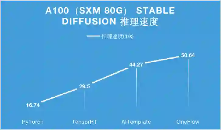 特别是在 SXM 80GB A100 上,OneFlow 首次让 Stable Diffusion 的推理速度达到了 50it/s 以上,首次把生成一张图片需要采样 50 轮的时间降到 1 秒以内,是当之无愧的性能之王。