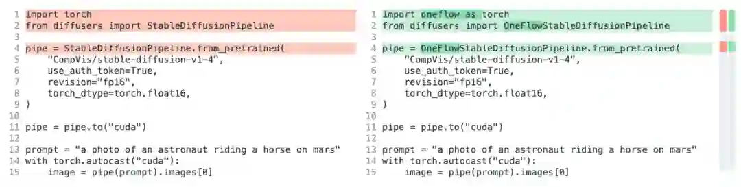 想体验 OneFlow Stable Diffusion?只需要修改三行代码,你就可以将 HuggingFace 中的 PyTorch Stable Diffusion 模型改为 OneFlow 模型,分别是将 import torch 改为 import oneflow as torch 和将 StableDiffusionPipeline 改为 OneFlowStableDiffusionPipeline: