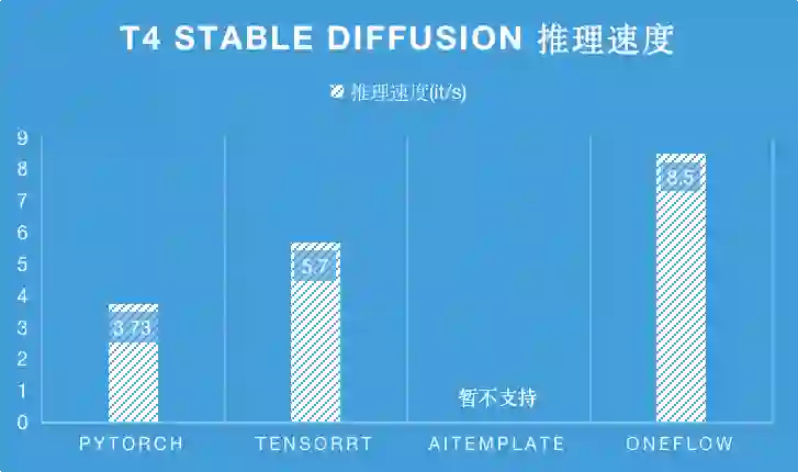 在 T4 推理卡上,由于 AITemplate 暂不支持 Stable Diffsuion,相比于目前 SOTA 性能的 TensorRT,OneFlow 的性能是它的 1.5 倍。