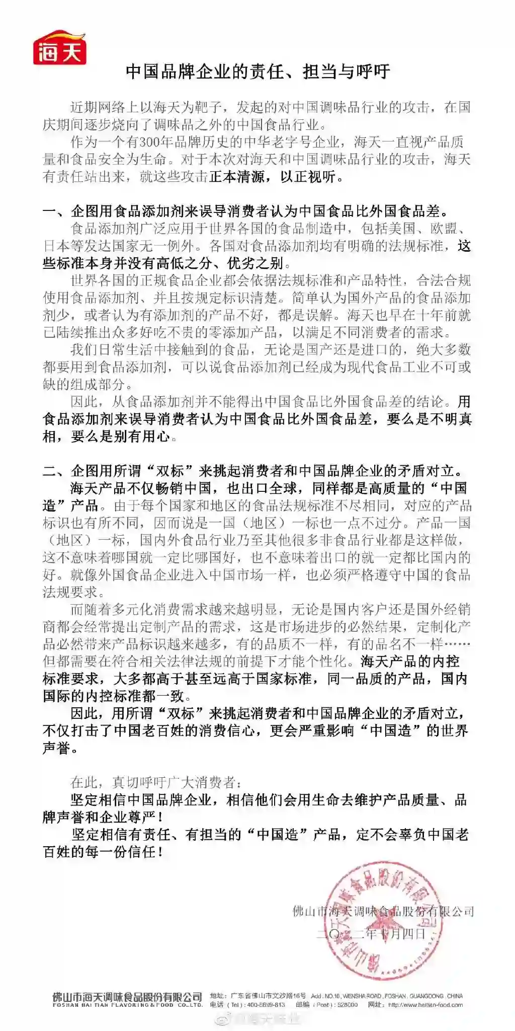9月30日和10月4日,海天味业(下称海天)先后发表两份声明予以回应。第一次,海天称产品符合国家标准,是部分短视频账号妖魔化食品添加剂、黑化中国食品安全,公司已对部分博主采取追责措施;第二次,海天表示食品添加剂广泛应用于世界各国的食品制造中,且一国(地区)一标,公司不存在“双标”行为。