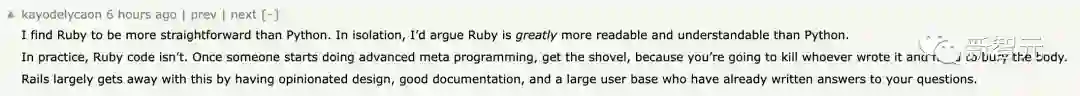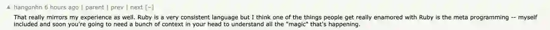 网友大赞,这确实反映了我真实的经历。Ruby是一门非常一致的语言,但我认为人们真正迷恋 Ruby 的是元编程,也包括我自己在内,很快你将需要在大脑中掌握大量上下文来理解所有正在发生的「魔力」。