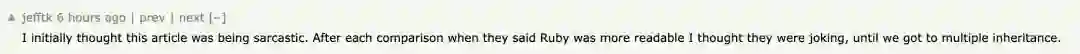 有网友认为这篇文章就是在讽刺。每次比较之后,当他们说Ruby更易读时,我都以为他们是在开玩笑,直到看到了多重继承这部分。