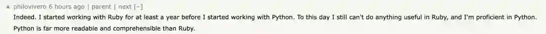 我精通的Python,直到现在我仍然无法在Ruby中做任何有用的事情。其实,Python比Ruby更具可读性、易懂。