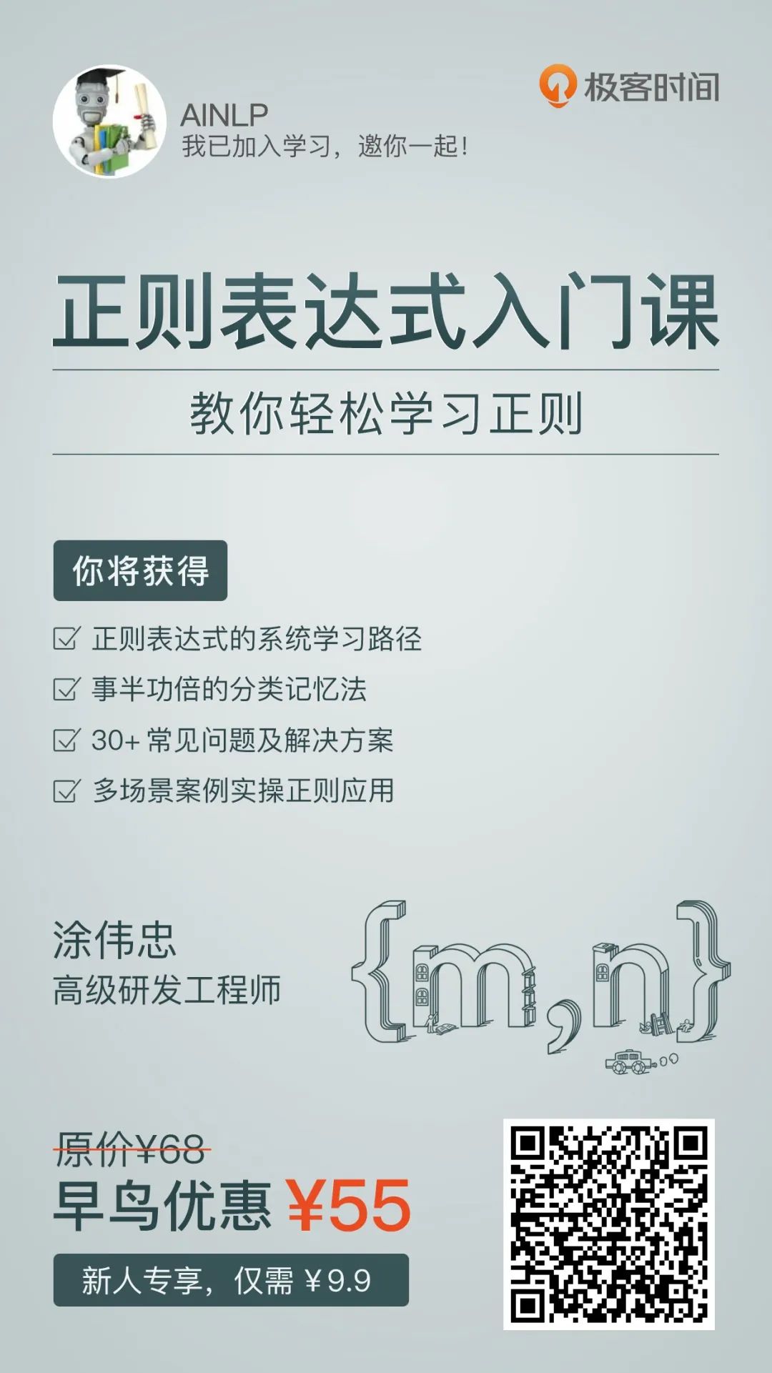 第一次读这本书的时候对正则表达式还无感,直到后来的工作中无数次和正则打交道才理解这样安排的意义,作为文字处理从业者,NLPer每天都在和文本打交道,没有正则表达式这个神器,工作效率估计会大打折扣,所以给大家推荐一门正则表达式的入门课,感兴趣的同学可以看看,以下是广告时间: