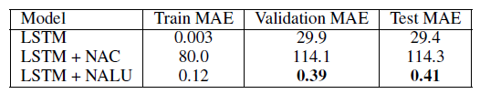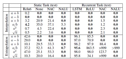 在这些初始合成实验中,我们展示了NAC 和NALU 在学习选择相关输入并应用不同算术函数的能力。其中测试任务分为两类:第一类为静态任务,即以单个向量一次性输入;第二类是循环任务,即输入按时间顺序来呈现。通过最小化平方损失来端到端地训练模型,模型的性能评估由两个部分组成:训练范围内(插值) 的留存值和训练范围外(外推) 的值。表1表明了几种标准体系结构在插值情况下成功完成任务,但在进行外推时都没有成功。而不管是在插值还是外推上,NAC 都成功地建立加法和减法模型,NALU 在乘法运算上也获得成功。