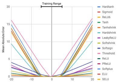 为了说明标准网络中的系统性失效,我们展示了各种MLPs 在学习标量恒等函数的表现。图1表明即使采用简单的框架,所有非线性函数都无法学习到超出训练范围外的数量表示。