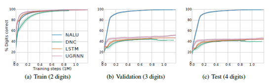 程序评估部分我们考虑两个方面:第一个为简单地添加两个大整数,第二个为包含若干个操作(条件声明、加和减)。此次评估专注于外推部分即:网络是否可以学习一种推广到更大数值范围的解决方案。用[0,100) 范围内的两位数整数来训练,并用三位或四位的随机整数来评估。图4比较了四种不同模型(UGRNN、LSTM、DNC 和NALU) 的评估结果,其中只有NALU 是能够推广到更大的数字。我们可以看到即使域增加了两个数量级,外推效果也是较为稳定。