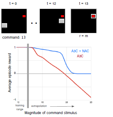 到目前为止,在所有实验中,我们训练的模型已经可以进行数值预测了。然而,正如引言部分所说,系统化的数值推算似乎是各种智能行为的基础。因此,我们进行了一项任务,测试NAC 能否被RL-trained 智能体“内部”使用。