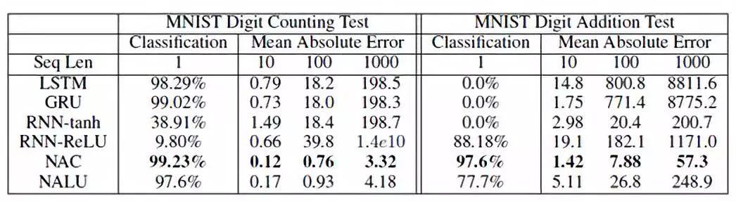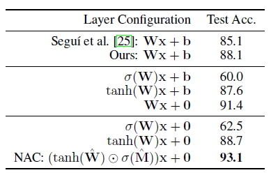 在我们的最后一项任务:MNIST 奇偶校验中,输入和输出都不是直接用数字提供的,而是隐式地对数字量进行推理。在这个实验中,NAC 或其变体取代了由Segui 等人提出的模型中的最后一个线性层。我们系统地研究了每个约束的重要性。表4总结了变体模型的性能,我们可以看到去除偏置项和运用非线性权重的方法显著提高了端到端模型的准确性,NAC 将先前最佳结果的误差减少了54%。