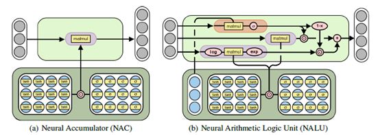 图2中,NAC 是输入的一次线性变换,变换矩阵是tanh(W) 和元素的乘积。NALU 使用两个带有固定系数的NACs 来进行加减运算(图2中较小的紫色单元) 以及乘除运算(图2中较大的紫色单元),并由门(图2中橙色的单元)来控制。