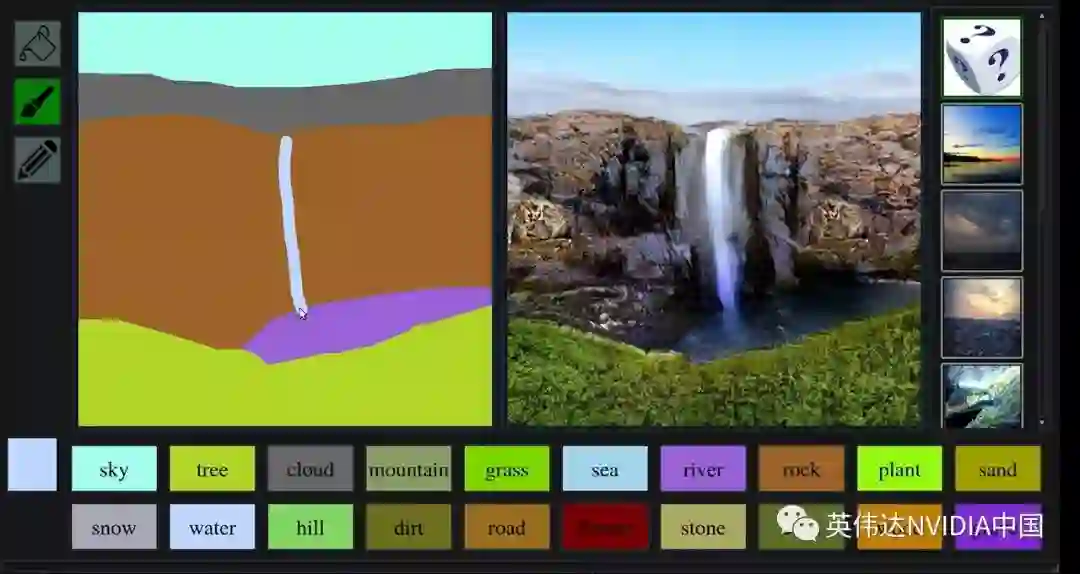 借助于GauGAN,用户能够绘制自己的分割图并构建场景,并用沙子、天空、海洋或雪等标签对每个部分进行标记。