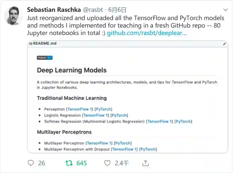 该项目的Github链接为:https://github.com/rasbt/deeplearning-models
